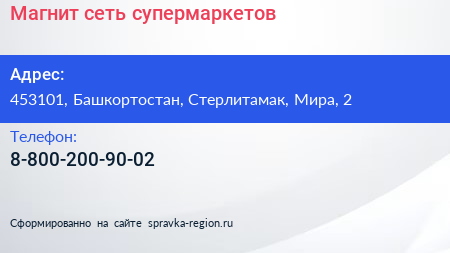 Магнит, сеть супермаркетов по адресу 453101, Башкортостан, Стерлитамак, Мира, 2 в дальнейшем Организация, размещена в следующих категориях: