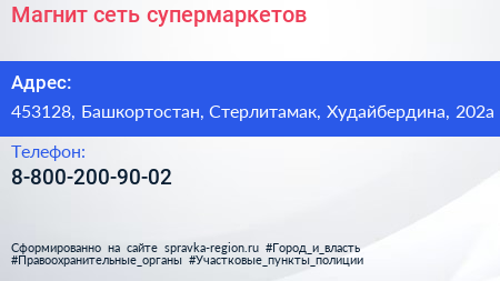 Магнит, сеть супермаркетов по адресу 453128, Башкортостан, Стерлитамак, Худайбердина, 202а в дальнейшем Организация, размещена в следующих категориях: