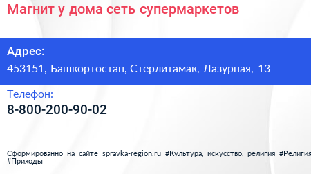 Магнит у дома, сеть супермаркетов по адресу 453151, Башкортостан, Стерлитамак, Лазурная, 13 в дальнейшем Организация, размещена в следующих категориях: