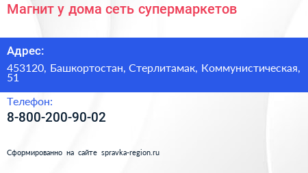 Магнит у дома, сеть супермаркетов по адресу 453120, Башкортостан, Стерлитамак, Коммунистическая, 51 в дальнейшем Организация, размещена в следующих категориях: