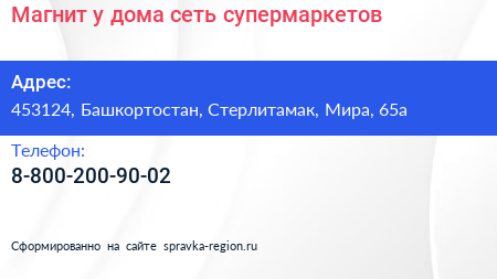 Магнит у дома, сеть супермаркетов по адресу 453124, Башкортостан, Стерлитамак, Мира, 65а в дальнейшем Организация, размещена в следующих категориях: