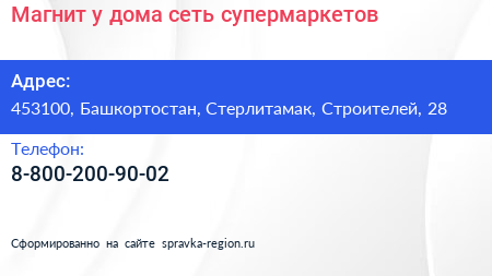 Магнит у дома, сеть супермаркетов по адресу 453100, Башкортостан, Стерлитамак, Строителей, 28 в дальнейшем Организация, размещена в следующих категориях: