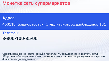 Монетка, сеть супермаркетов по адресу 453118, Башкортостан, Стерлитамак, Худайбердина, 131 в дальнейшем Организация, размещена в следующих категориях: