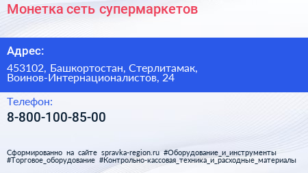 Монетка, сеть супермаркетов по адресу 453102, Башкортостан, Стерлитамак, Воинов-Интернационалистов, 24 в дальнейшем Организация, размещена в следующих категориях:
