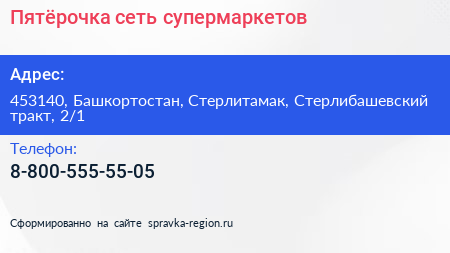 Пятёрочка, сеть супермаркетов по адресу 453140, Башкортостан, Стерлитамак, Стерлибашевский тракт, 2/1 в дальнейшем Организация, размещена в следующих категориях: