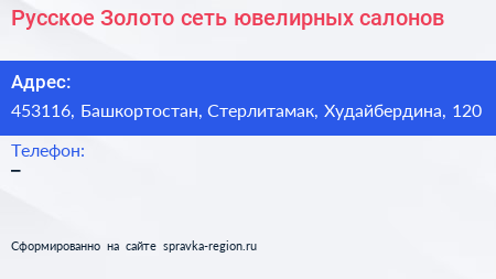 Русское Золото, сеть ювелирных салонов по адресу 453116, Башкортостан, Стерлитамак, Худайбердина, 120 в дальнейшем Организация, размещена в следующих категориях: