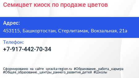Семицвет, киоск по продаже цветов по адресу 453115, Башкортостан, Стерлитамак, Вокзальная, 21а в дальнейшем Организация, размещена в следующих категориях: