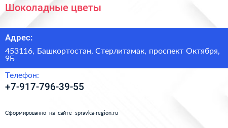 Шоколадные цветы по адресу 453116, Башкортостан, Стерлитамак, проспект Октября, 9Б в дальнейшем Организация, размещена в следующих категориях: