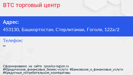 ВТС, торговый центр по адресу 453130, Башкортостан, Стерлитамак, Гоголя, 122а/2 в дальнейшем Организация, размещена в следующих категориях: