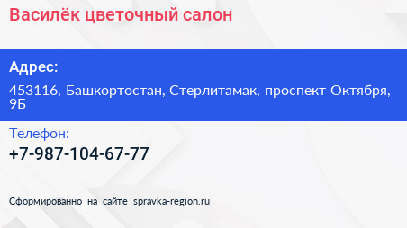 Василёк, цветочный салон по адресу 453116, Башкортостан, Стерлитамак, проспект Октября, 9Б в дальнейшем Организация, размещена в следующих категориях: