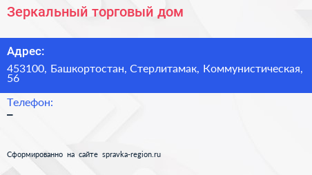 Зеркальный, торговый дом по адресу 453100, Башкортостан, Стерлитамак, Коммунистическая, 56 в дальнейшем Организация, размещена в следующих категориях: