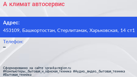 А-климат, автосервис по адресу 453109, Башкортостан, Стерлитамак, Харьковская, 14 ст1 в дальнейшем Организация, размещена в следующих категориях: