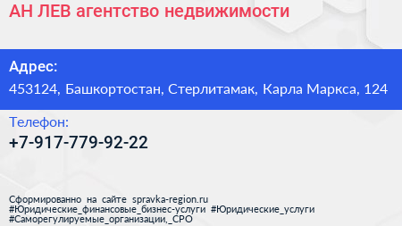 АН ЛЕВ, агентство недвижимости по адресу 453124, Башкортостан, Стерлитамак, Карла Маркса, 124 в дальнейшем Организация, размещена в следующих категориях: