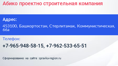 Абико, проектно-строительная компания по адресу 453100, Башкортостан, Стерлитамак, Коммунистическая, 66а в дальнейшем Организация, размещена в следующих категориях: