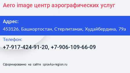 Aero-image, центр аэрографических услуг по адресу 453126, Башкортостан, Стерлитамак, Худайбердина, 79а в дальнейшем Организация, размещена в следующих категориях: