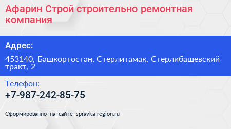 Афарин-Строй, строительно-ремонтная компания по адресу 453140, Башкортостан, Стерлитамак, Стерлибашевский тракт, 2 в дальнейшем Организация, размещена в следующих категориях: