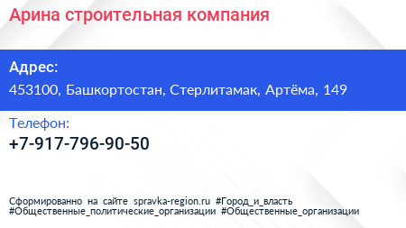 Арина, строительная компания по адресу 453100, Башкортостан, Стерлитамак, Артёма, 149 в дальнейшем Организация, размещена в следующих категориях: