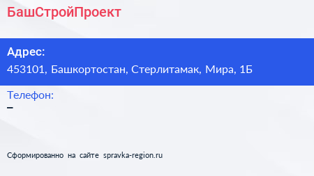 БашСтройПроект по адресу 453101, Башкортостан, Стерлитамак, Мира, 1Б в дальнейшем Организация, размещена в следующих категориях: