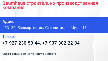 Baumhaus, строительно-производственная компания по адресу 453124, Башкортостан, Стерлитамак, Мира, 11 в дальнейшем Организация, размещена в следующих категориях: