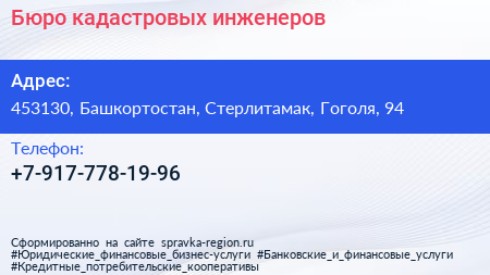 Бюро кадастровых инженеров по адресу 453130, Башкортостан, Стерлитамак, Гоголя, 94 в дальнейшем Организация, размещена в следующих категориях: