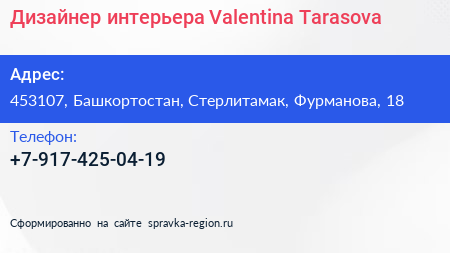 Дизайнер интерьера Valentina Tarasova по адресу 453107, Башкортостан, Стерлитамак, Фурманова, 18 в дальнейшем Организация, размещена в следующих категориях: