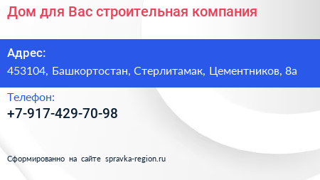 Дом для Вас, строительная компания по адресу 453104, Башкортостан, Стерлитамак, Цементников, 8а в дальнейшем Организация, размещена в следующих категориях: