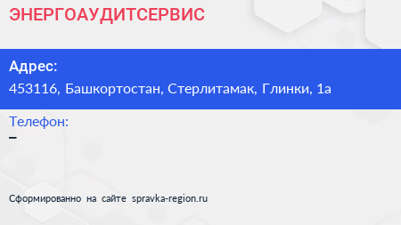 ЭНЕРГОАУДИТСЕРВИС по адресу 453116, Башкортостан, Стерлитамак, Глинки, 1а в дальнейшем Организация, размещена в следующих категориях: