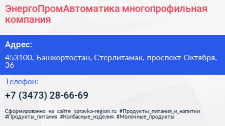 ЭнергоПромАвтоматика, многопрофильная компания по адресу 453100, Башкортостан, Стерлитамак, проспект Октября, 36 в дальнейшем Организация, размещена в следующих категориях: