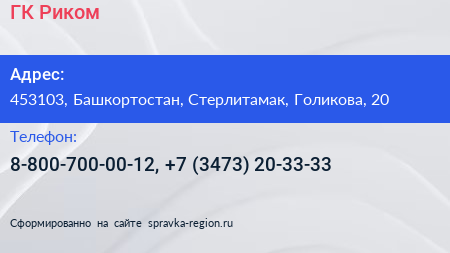 ГК Риком по адресу 453103, Башкортостан, Стерлитамак, Голикова, 20 в дальнейшем Организация, размещена в следующих категориях: