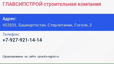 ГЛАВСИПСТРОЙ, строительная компания по адресу 453101, Башкортостан, Стерлитамак, Гоголя, 2 в дальнейшем Организация, размещена в следующих категориях: