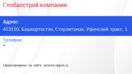 Глобалстрой, компания по адресу 453110, Башкортостан, Стерлитамак, Уфимский тракт, 1 в дальнейшем Организация, размещена в следующих категориях: