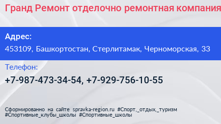 Гранд-Ремонт, отделочно-ремонтная компания по адресу 453109, Башкортостан, Стерлитамак, Черноморская, 33 в дальнейшем Организация, размещена в следующих категориях: