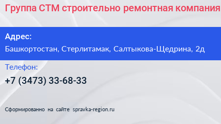 Группа СТМ, строительно-ремонтная компания по адресу Башкортостан, Стерлитамак, Салтыкова-Щедрина, 2д в дальнейшем Организация, размещена в следующих категориях: