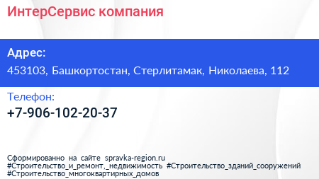 ИнтерСервис, компания по адресу 453103, Башкортостан, Стерлитамак, Николаева, 112 в дальнейшем Организация, размещена в следующих категориях: