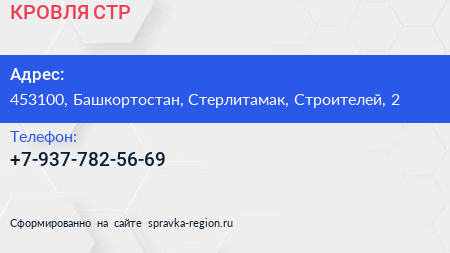 КРОВЛЯ-СТР по адресу 453100, Башкортостан, Стерлитамак, Строителей, 2 в дальнейшем Организация, размещена в следующих категориях: