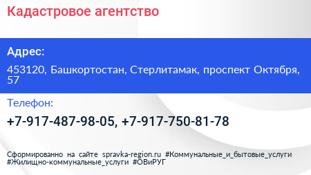 Кадастровое агентство по адресу 453120, Башкортостан, Стерлитамак, проспект Октября, 57 в дальнейшем Организация, размещена в следующих категориях: