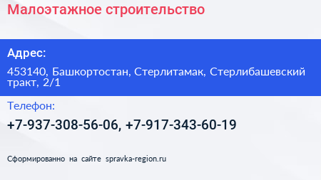 Малоэтажное строительство по адресу 453140, Башкортостан, Стерлитамак, Стерлибашевский тракт, 2/1 в дальнейшем Организация, размещена в следующих категориях:
