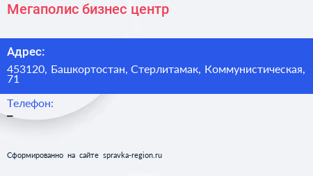 Мегаполис, бизнес-центр по адресу 453120, Башкортостан, Стерлитамак, Коммунистическая, 71 в дальнейшем Организация, размещена в следующих категориях: