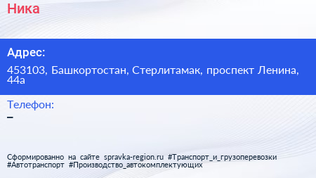 Ника по адресу 453103, Башкортостан, Стерлитамак, проспект Ленина, 44а в дальнейшем Организация, размещена в следующих категориях: