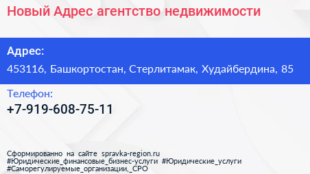 Новый Адрес, агентство недвижимости по адресу 453116, Башкортостан, Стерлитамак, Худайбердина, 85 в дальнейшем Организация, размещена в следующих категориях: