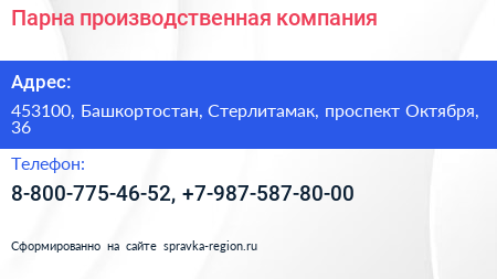Парна, производственная компания по адресу 453100, Башкортостан, Стерлитамак, проспект Октября, 36 в дальнейшем Организация, размещена в следующих категориях: