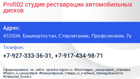 Profi02, студия реставрации автомобильных дисков по адресу 453104, Башкортостан, Стерлитамак, Профсоюзная, 7а в дальнейшем Организация, размещена в следующих категориях: