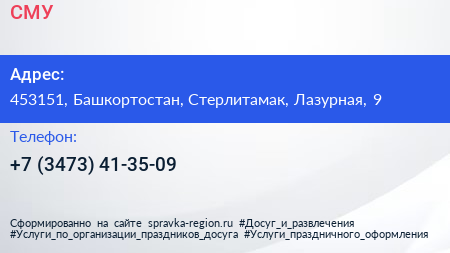 СМУ по адресу 453151, Башкортостан, Стерлитамак, Лазурная, 9 в дальнейшем Организация, размещена в следующих категориях: