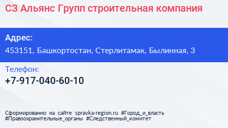 СЗ Альянс-Групп, строительная компания по адресу 453151, Башкортостан, Стерлитамак, Былинная, 3 в дальнейшем Организация, размещена в следующих категориях: