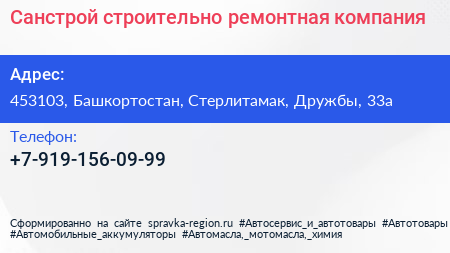 Санстрой, строительно-ремонтная компания по адресу 453103, Башкортостан, Стерлитамак, Дружбы, 33а в дальнейшем Организация, размещена в следующих категориях: