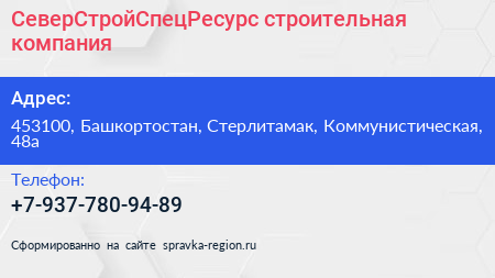 СеверСтройСпецРесурс, строительная компания по адресу 453100, Башкортостан, Стерлитамак, Коммунистическая, 48а в дальнейшем Организация, размещена в следующих категориях:
