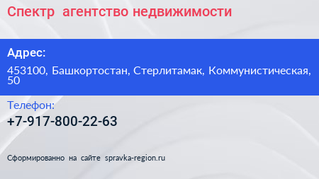 Спектр+, агентство недвижимости по адресу 453100, Башкортостан, Стерлитамак, Коммунистическая, 50 в дальнейшем Организация, размещена в следующих категориях: