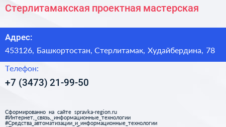 Стерлитамакская проектная мастерская по адресу 453126, Башкортостан, Стерлитамак, Худайбердина, 78 в дальнейшем Организация, размещена в следующих категориях: