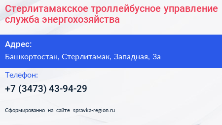 Стерлитамакское троллейбусное управление, служба энергохозяйства по адресу Башкортостан, Стерлитамак, Западная, 3а в дальнейшем Организация, размещена в следующих категориях: