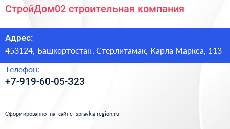 СтройДом02, строительная компания по адресу 453124, Башкортостан, Стерлитамак, Карла Маркса, 113 в дальнейшем Организация, размещена в следующих категориях: